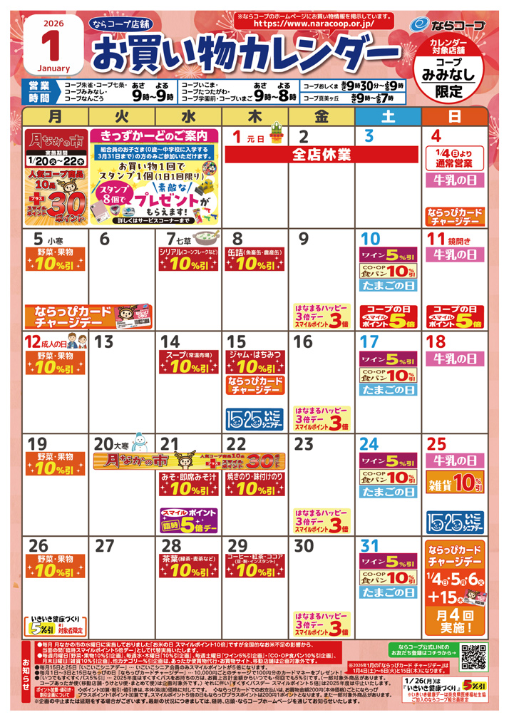 コープあったか便、宅配便、ぴゅあウォーター、くらしの相談コーナー、キャッシュコーナー(南都銀行)、農産物直売所、酒、自動写真撮影機、リサイクルコーナー(※)