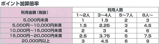 ご利用金額100円につき0.1ポイントを加算します。また、ご利用金額と班のご利用人数によってそれぞれに加算倍率を設け、ポイントを貯める楽しみを増やしています。(ポイント加算倍率は下記参照)
