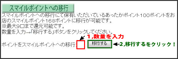 100ポイント単位でお店の「スマイルポイント」へ移行ができます。