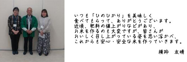 「お米を作る農家さんは減少していると聞いています。たくさんなご苦労があると思いますが、”ひのひかり"大好きなので頑張って欲しいと思います。もうすぐ新米が出ると思いますのですごく楽しみです。