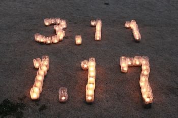 今年は新型コロナウイルス感染が収束しない中、燈火会のみの開催となりましたが、災害時の備えを考える機会になることを願い、夕暮れとともに、ペットボトルのランタンに灯をともし、集まった48枚のメッセージを、参加した27人で覆い、亡くなられた方々のご冥福をお祈りしました。