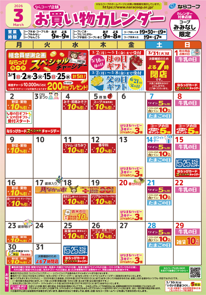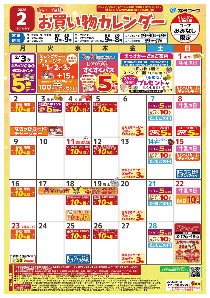コープあったか便、宅配便、ぴゅあウォーター、くらしの相談コーナー、キャッシュコーナー(南都銀行)、農産物直売所、酒、自動写真撮影機、リサイクルコーナー(※)