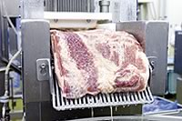 ベーコンなどの製品では定番の風景。たくさんのハリで調味液を注入します。とても美味しそうです。 |
