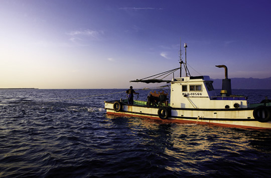 鹿児島県は大隅半島の東側、志布志湾のほぼ中央に位置する志布志市。半島を西へ超えれば、そこは桜島が浮かぶ鹿児島湾。平成18年1月1日、それまでの曽於郡松山町・志布志町・有明町が合併して生まれた街。海辺にはシュロによく似た枇榔(びろう)の木々が潮風を受け、訪れた者に南国の風情を伝えている。 美味で知られるトラガニ・ウチワエビをはじめ、ミズイカやハモが豊富な志布志の海は、春から初夏にかけてちりめん漁で大いに賑わう。昨年は宮崎など近隣の漁場を尻目に、ひときわの豊漁で活気づいた。 東の水平線が、ほんのり明るくなる頃、男たちが次々と船に乗り込んで漁がはじまる。1艘もしくは2艘の船でU字型になった網を曳きながら、夜明けの湾内を滑走する漁船。その先には魚群探知機を積んだ誘導船がいて、海面下2〜3メートルを群れるカタクチイワシの稚魚(=ちりめんじゃこ)を追う。海面に黄金色のかがやきを映しながら、夜明けの太陽に包まれてひかるその姿は息をのむほどに美しい。 網を曳き終えた漁船は、海上で誘導船への水揚げをおこなう。まるでガーゼのようにきめ細かな袋をあげる一瞬、白く透明で糸のような「生きて泳ぐちりめん」の姿が現れる。海水をこして、ちりめんを水色の樽に手早く詰め込むと、船は荷下ろし場へと疾走する。湾岸では小型クレーン付きのトラックが到着を待っている。