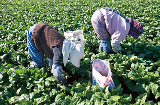 人手をかけ、工夫した機械を使って除草剤を使わずに育成。 農薬は当地比5割減(使用回数)で、安心なほうれん草を栽培。