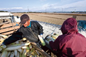 生産のしくみは、今もまったく変わらなかった。ちがうのは大根をその場では洗わないこと。農家の庭先で自動ブラシ機に入れたり、小屋の中で作業する。そのまま千切りもおこない、トラクターに積んでくる人が昔ながらの「手撒き」を続けていた。つめたく透きとおった風に吹かれながら、重いざるに腰を曲げて撒くおじいちゃん、おばあちゃん。その背中がだんだん小さくなって、あとに絹を想わせる白い帯が現れる。