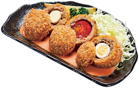 北海道ビーフハンバーグ・・・・4枚、うずらの卵(水煮)・ミニトマト・・・・各4個、 プロセスチーズ・・・・4かけ、パン粉・小麦粉・サラダ油・・・・適量、 卵・・・・1個、ケチャップ・・・・大さじ3、マヨネーズ・・・・大さじ2