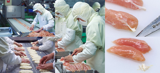 工場では、最初に原料のササミをカット処理する。ひとつひとつを手作業で素早く丁寧に固いスジなどを取り除く。別の場所では肉の下味を付ける調味液の製造も。本醸造薄口醤油やチキンスープなどを調合するが、チキンスープは自社の調味料工場の製品。親鶏を丸ごと煮込んで旨味を出す。カット処理を終えたササミに調味液を加える作業では、真空にした状態で攪拌(かくはん)。これで肉にじっくりと味が染みこむ。