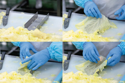 まずは、キャベツ。製造工場の地元(愛媛県大洲市)を中心に国内農家が栽培したものを使う。芯抜き機を片手に、ひとつひとつ芯をくり抜く作業員。それをお湯に浸けて葉をバラバラにほぐす工程を見ていると、作り方の基本も家庭とおなじであることが判る。