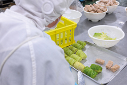 製造現場で目を惹いたのは、キャベツを手巻きする作業員の姿。その大半は地元のお母さんたち。凹型の金具にキャベツの葉を敷き、タネを入れ、巻き上げてゆくスピードはまさに圧巻。たいへんな個数をひとつひとつ手作業でこなすからには当然だといえる。が、不揃いもなく並ぶ巻き上がりの数々には、不思議な美しさが・・・・